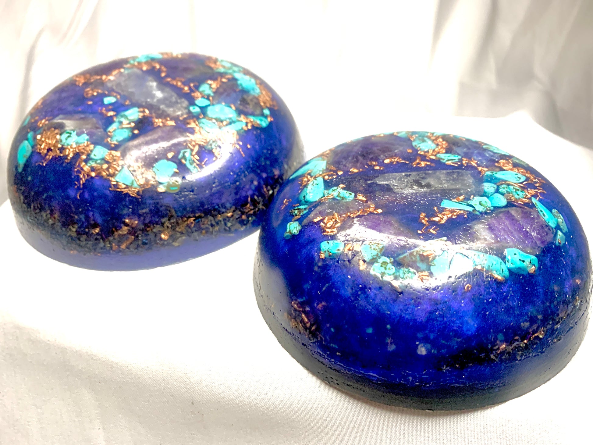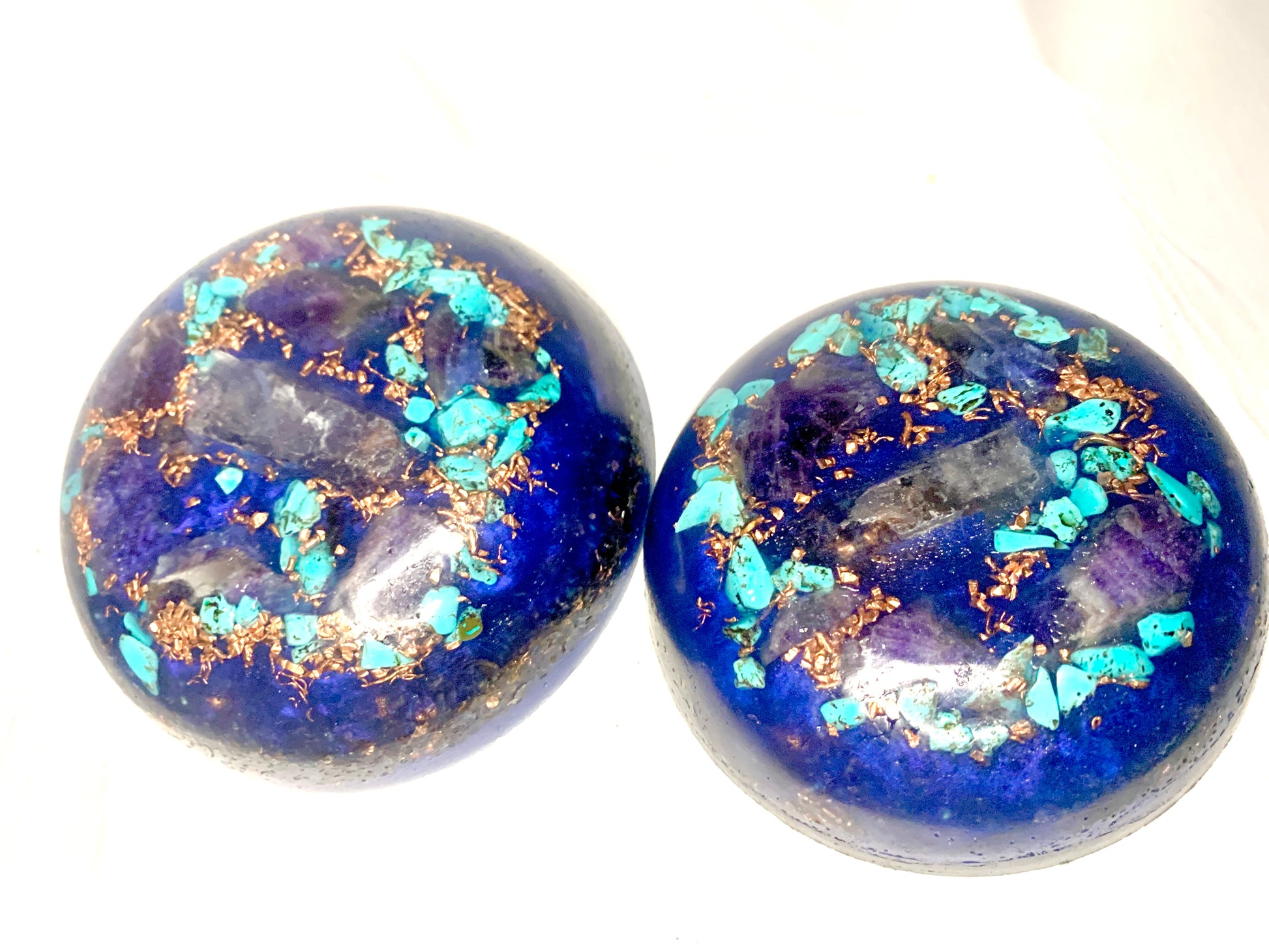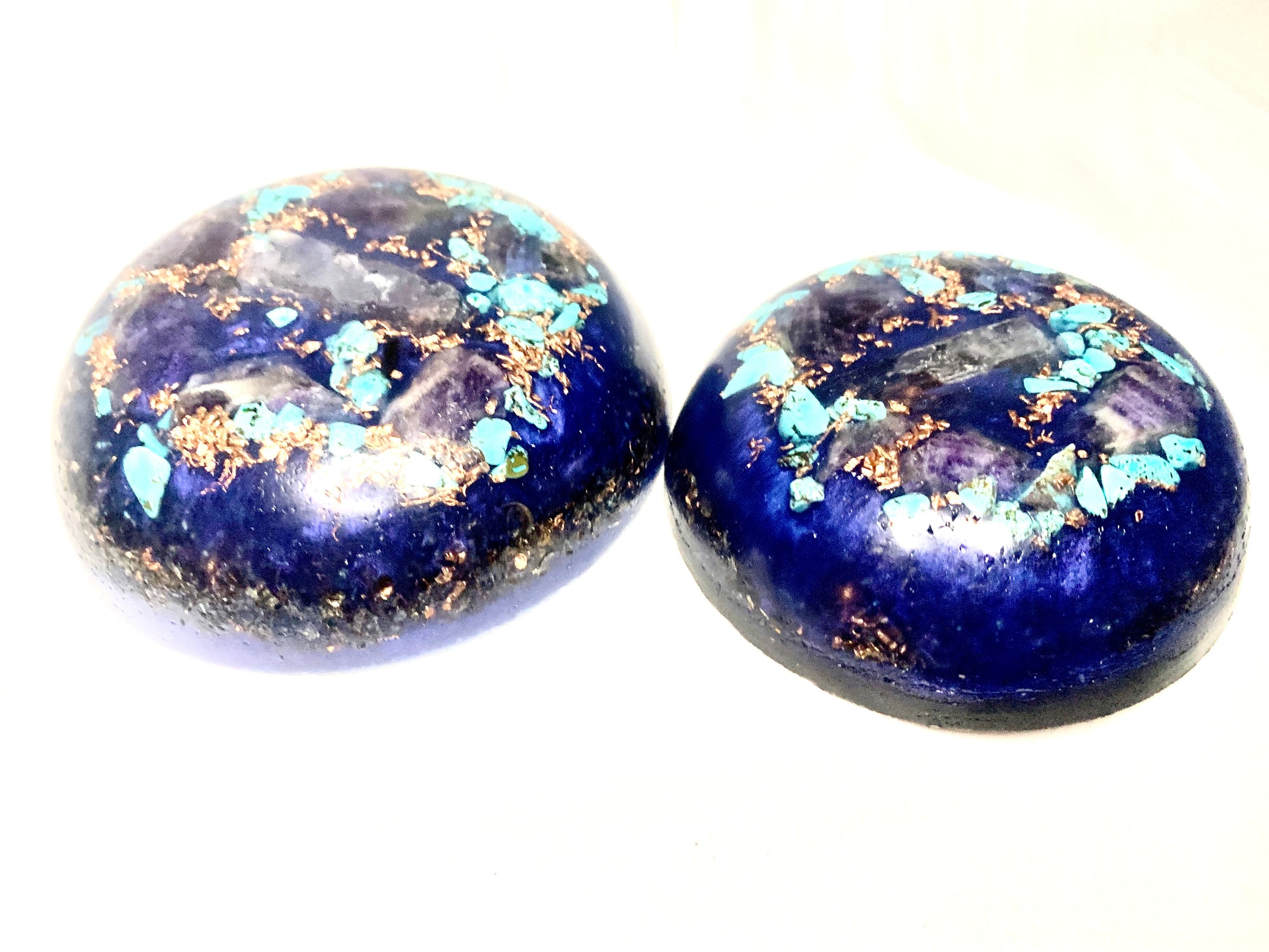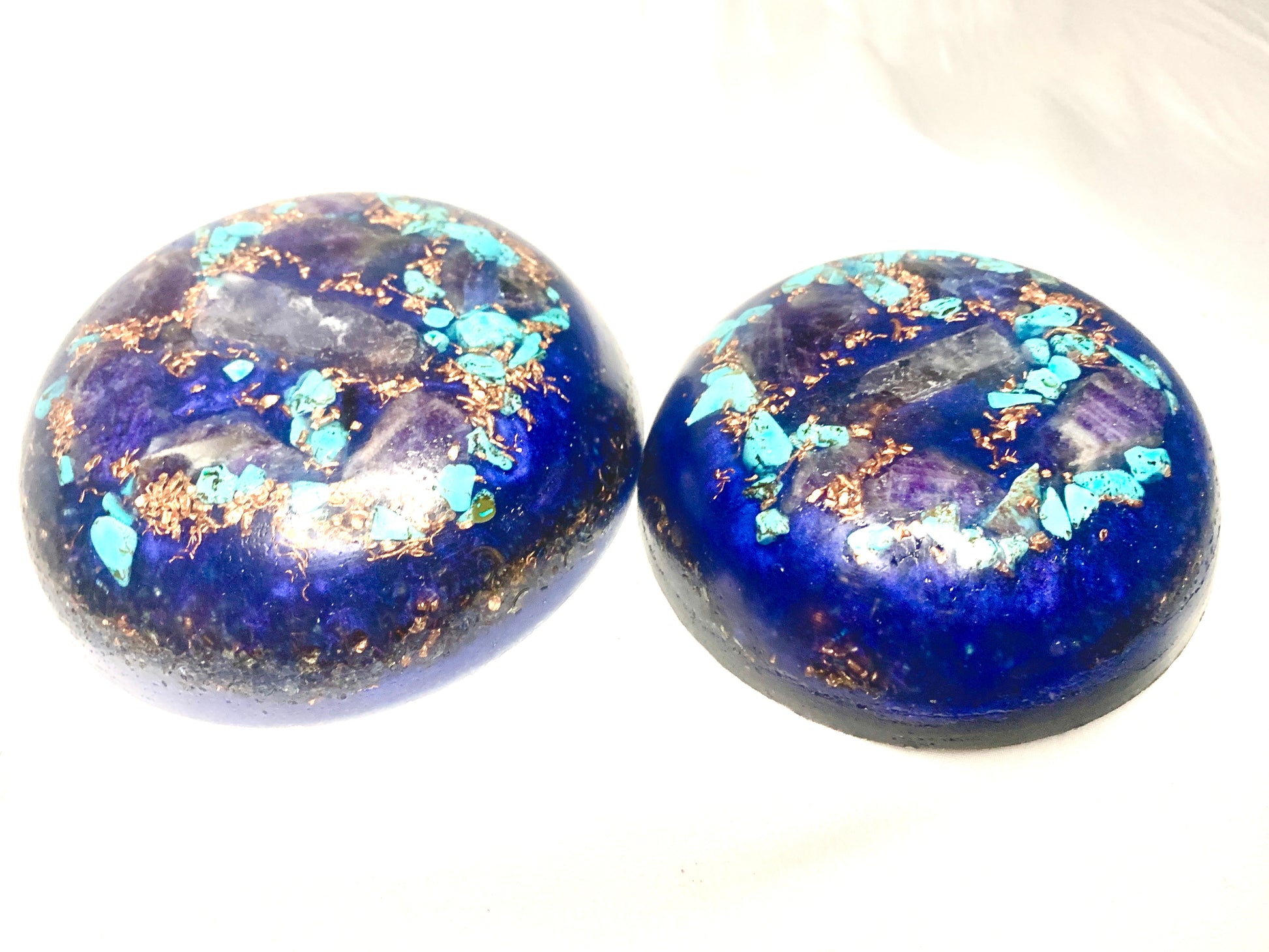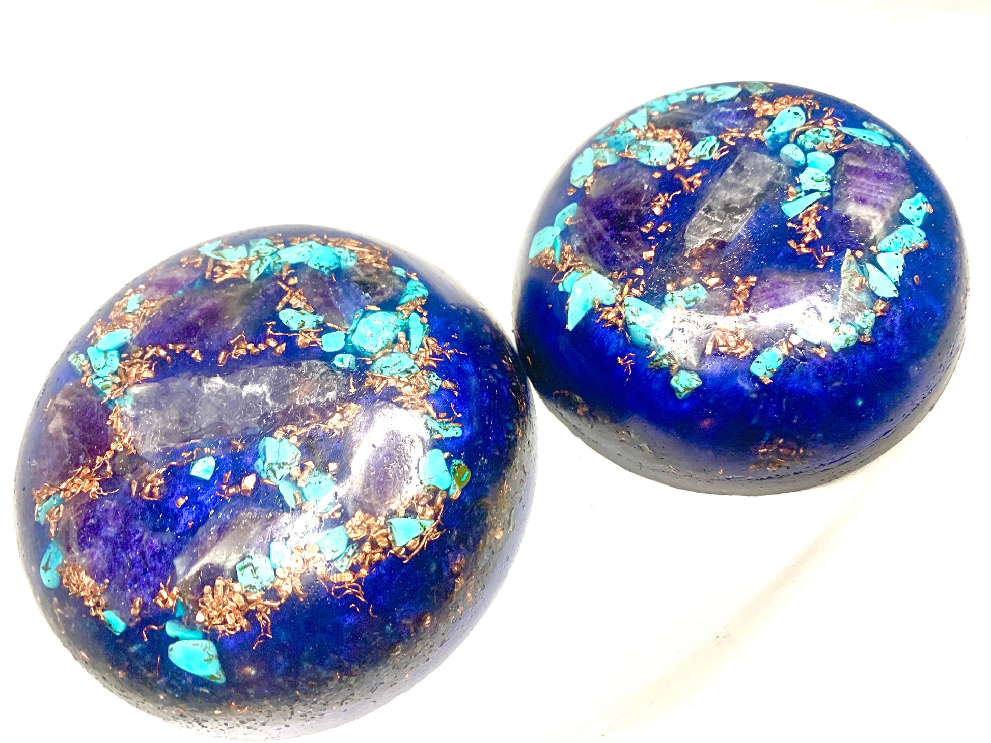 a lovely set of 2 custom crafted KayJay "Majestic Aqua" themed mini Orgone bunker busters to awaken your favorite room, home, apartment, office, garage,etc. These units are a very powerful combination to secure any room of your home with solid robust Orgone Energy. This is a custom set so each one sold may vary in appearance in a small amount from the photo images however the units will be almost identical and equally as stunning and captivating of that you can be assured! great for meditation, decoration, emf protection, and much more!