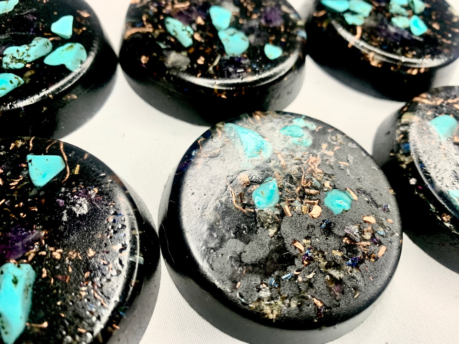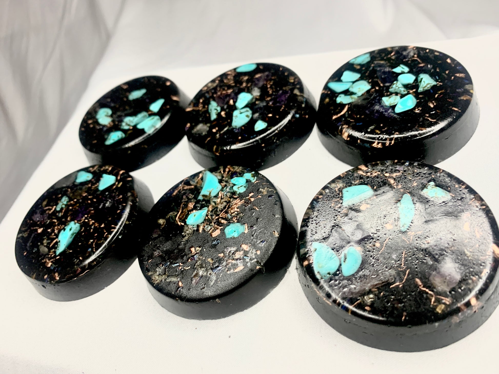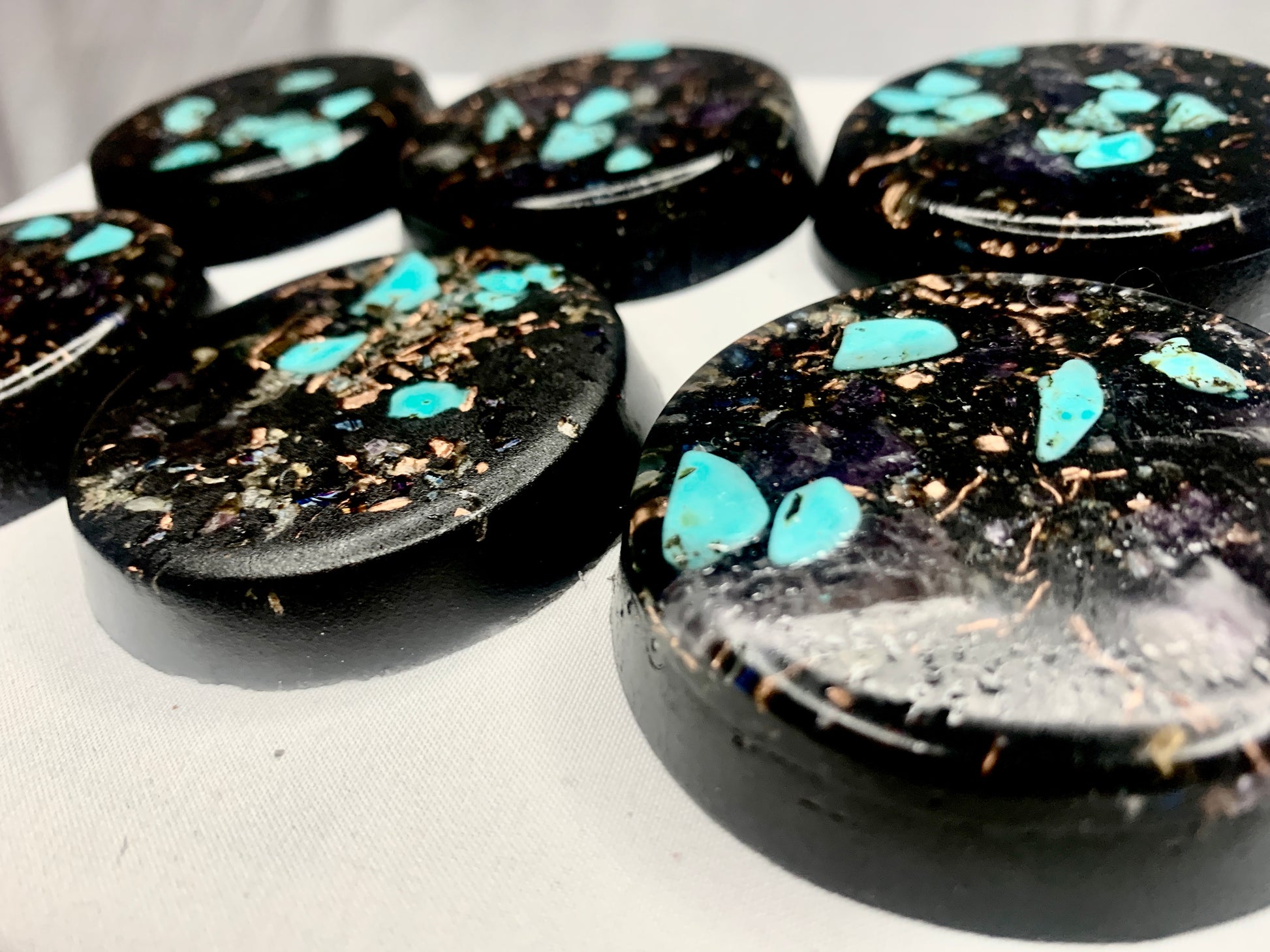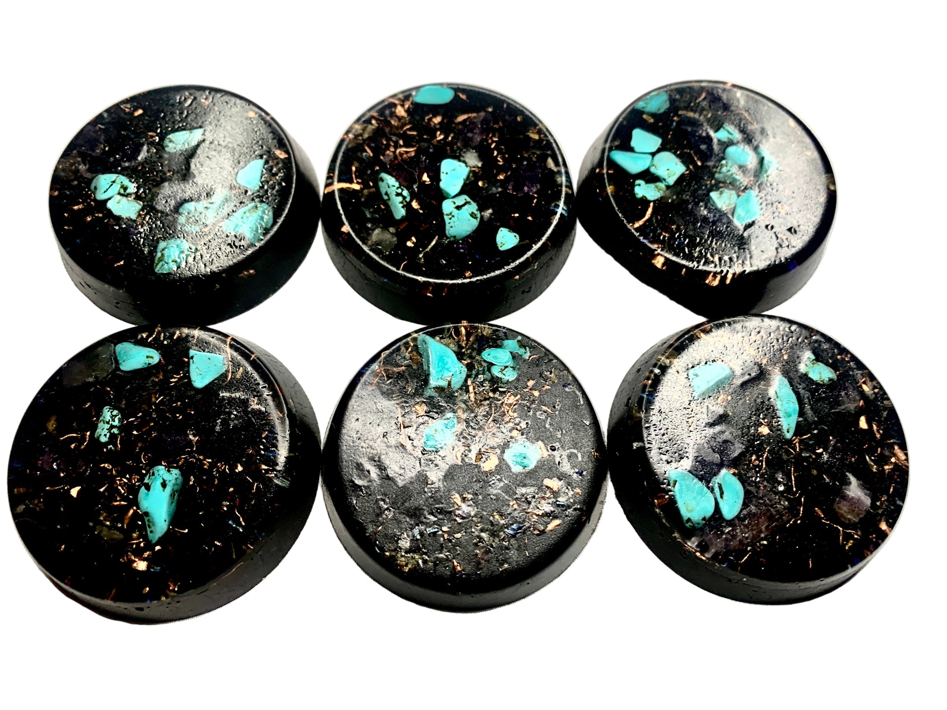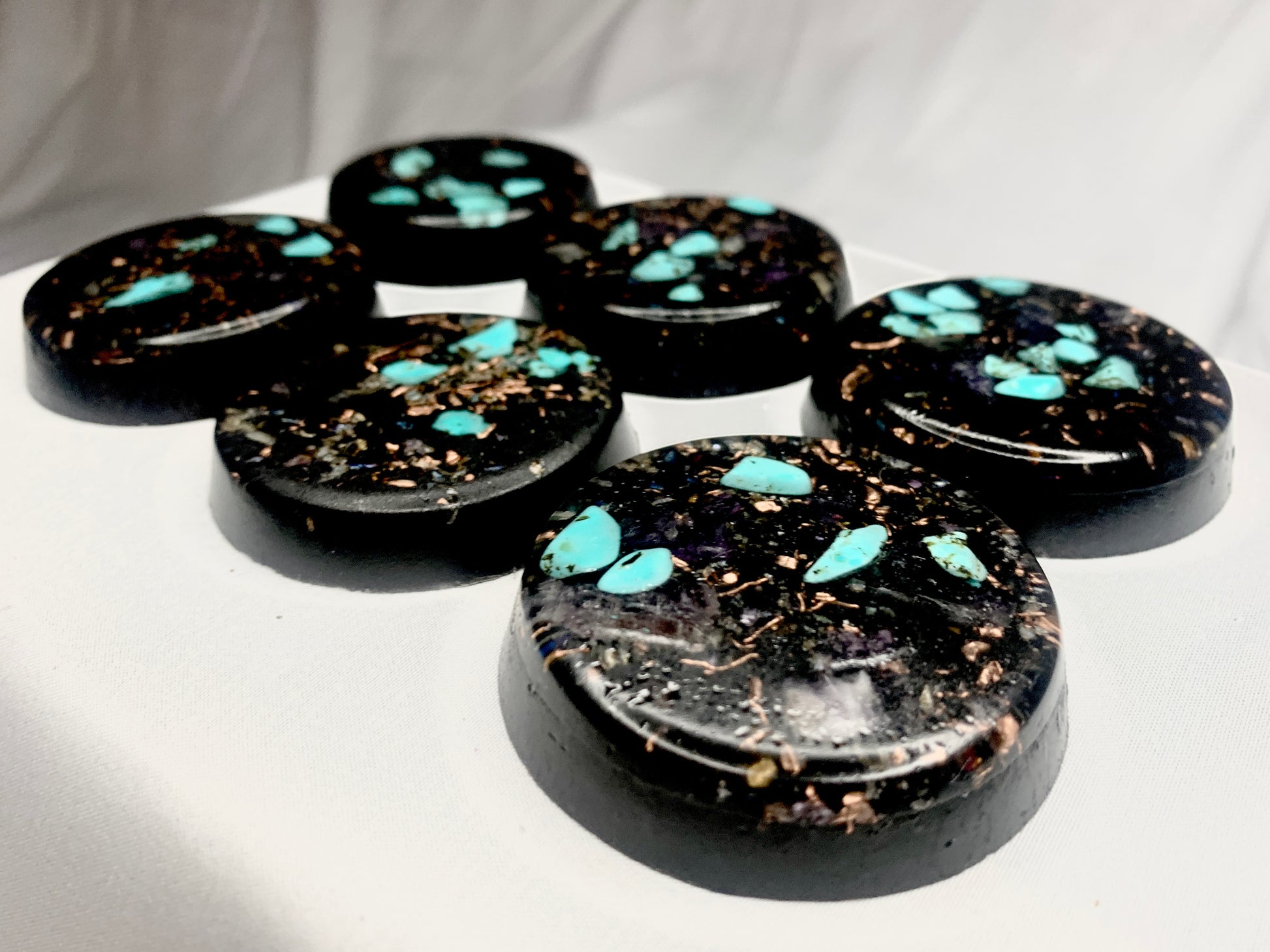 a lovely well crafted set of 6 powerful and compact Orgone energy wellness pucks for EMF protection, home or office decoration, conceal carry, energy work, healing, meditation, improved sleep, and other possible benefits.