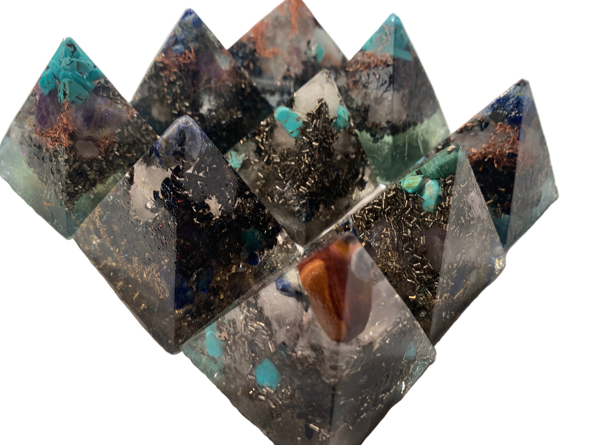a lovely set of 9 Elite quartz crystal Orgone Energy Pyramids for EMF home Protection office decoration gift headache relief great gifts for all kids This is a superb set of 9 KayJay Wellness Elite Orgone Energy Pyramids all hand made with quartz crystals Turquoise and Copper and other components for healing and EMF protection and decoration. We take tremendous pride in crafting by hand some of the most potent and sought after Orgone Energy pyramids inspired by worthy humans seeking to make substantial improvements in general and personal wellness with alternative natural means. Many of our customers, friends, neighbors, and clients are reporting sharp and noticeable improvements in areas such as quality of sleep, reduction or elimination in EMF and Wifi symptoms, happier moods, increased positivity, improved immune system function, and much more! This is a high quality very potent set of 9 Orgone Energy pyramids that can be used as a complete Orgone Energy home system by securing your home with powerful Orgone Energy that will surely help negate many harmful effects of exposure to harmful electro smog pollution. We pride ourselves with being very generous and innovative with every order placed. We consider you all our extended family and are always here and willing to help with any questions or concerns. This set of 9 Orgone Pyramids can also be used as a wonderful gift package that can give multiple individuals or families their very first orgone energy pyramids! Let your spirit guide you as to how best to use your new hand made set of 9 KayJay Wellness Elite Orgone Pyramids! We trust that you will be amazed at the subtle improvements and gain in quality of life that can be had while living with Orgone. As our testimonies will validate we are extremely grateful for your continued support and we are very sincere and dedicated to our craft here at KayJay Wellness! Please allow us to help with any queries or concerns.